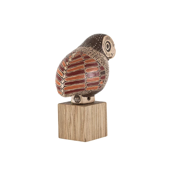 Ce type de petits vases, nommé Aryballe, sert durant l’Antiquité grecque à mettre l’huile d’olive dont s’enduisent les athlètes nus pour se protéger du soleil durant les compétitions. Le corps de l’animal sert de réservoir et un petit trou au niveau de la queue permet l’écoulement du liquide. La forme adoptée pour le vase varie selon le souhait du destinataire. Pour cette aryballe, la chouette fait référence à la divinité Athéna, déesse de la sagesse et de l’intelligence guerrière.