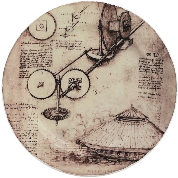 Assiette en faïence reprenant les croquis des plus célèbres inventions réalisés par l’inventeur italien Léonard de Vinci.