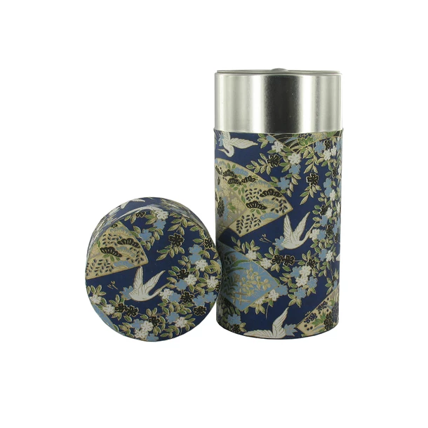 Boîte à thé en métal et papier avec un motif traditionnel japonais.