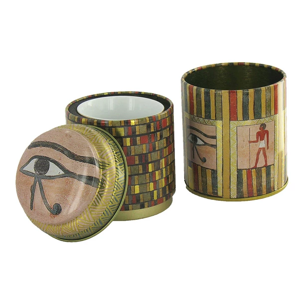 Ensemble de deux tasses avec boîte en métal, aux couleurs de l’Égypte antique.