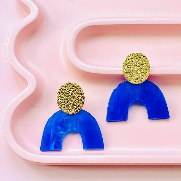 Boucles d’oreilles de forme géométrique dorées à l’or fin et acétate bleue.