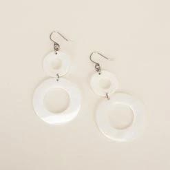 D’élégantes boucles d’oreilles en forme de double-disques percés en nacre blanche.