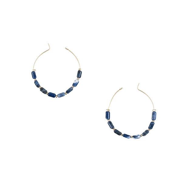 Ces boucles d’oreilles en sodalite et laiton doré s’inspirent des parures des civilisations antiques égyptiennes et mésopotamiennes faites de perles de faïence ou de lapis-lazulis.
