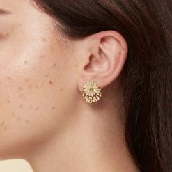 Ces boucles d’oreilles en laiton et résine s’inspirent d’estampes et ornements du XVIIIe siècle.