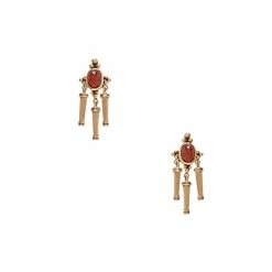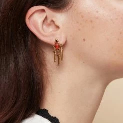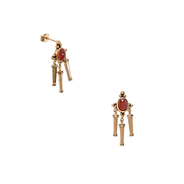 Ces boucles d’oreilles en laiton doré et cornaline inspirées d’un collier sont composées de trois petites pendeloques identiques en forme de glands allongés ou de petits vases très étroits.