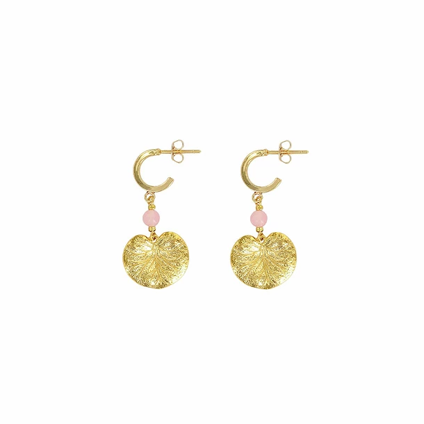 Ces boucles d’oreilles en forme de nymphéa en étain doré et perle de quartz rose sont librement inspirées de la célèbre série des peintures de Claude Monet: Les Nymphéas, réalisée entre 1890 et 1926.