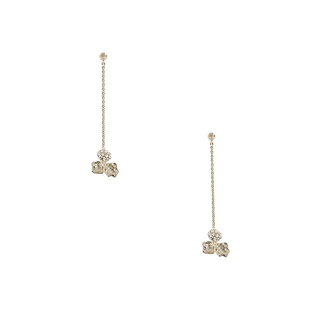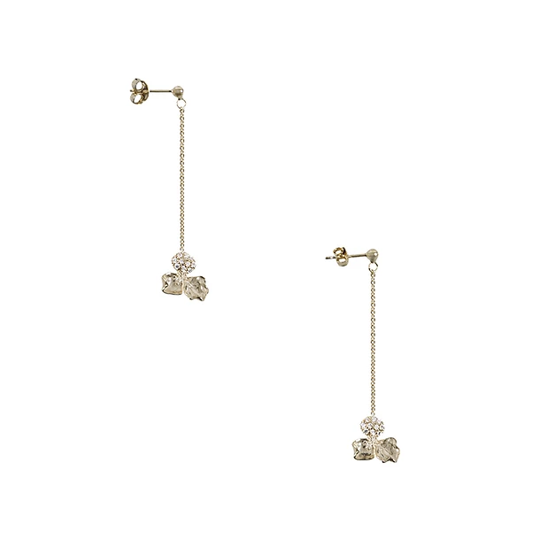 Boucles d’oreilles pendantes composées d’une fine chaine en laiton plaquée or et d’un trèfle recouvert de cristaux et golden Shadow.