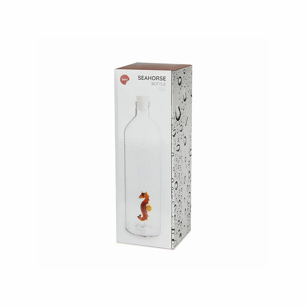Carafe d’eau Balvi en verre borosilicate avec un bouchon de silicone, une figurine d’hippocampe en verre coloré est fixée à l’intérieur.