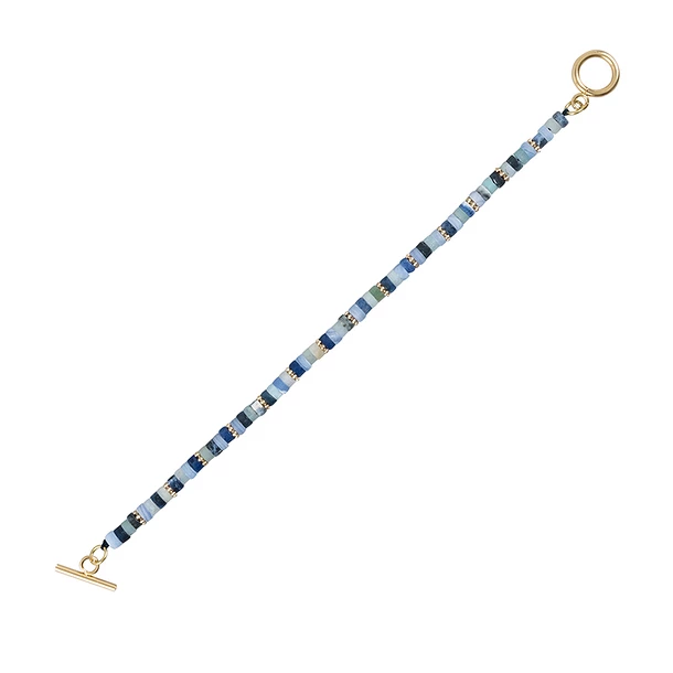 Ce bracelet en perles de fluorite, sodalite et laiton doré est inspiré d’un collier dit de Bactriane avec des petites perles cylindriques en lapis lazuli associées à trente perles en or et à un pendentif en forme de tige portant deux disques (Bactriane, -2100 / -1900 (2e moitié IIIe mill av. J.-C. (?)).