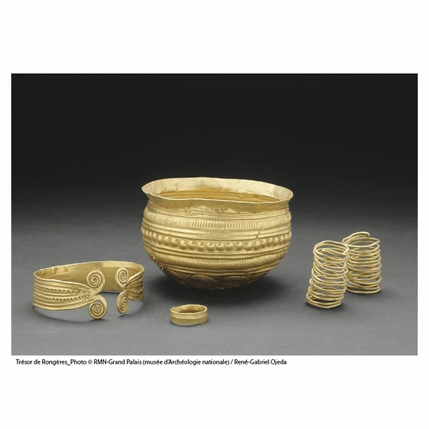 En 1911, on trouva dans un champs, à Rongères (Allier) un dépôt d’objets en or : un bracelet, deux spirales, une bague, étaient contenus dans une tasse de même métal au décor repoussé et estampé. Le bracelet se compose d’un épais ruban au décor en relief moulé, repris au poinçon, pour les petites cupules ; les extrémités se terminent par des fils enroulés en double volutes. Ce bijou est, comme les autres éléments du dépôt, d’un type caractéristique des productions de cette époque en Europe Centrale et Septentrionale, mais beaucoup plus rare à l’Ouest, ce qui confère un intérêt exceptionnel à cette trouvaille parmi les plus connues de la luxuriante orfèvrerie de l’Age du Bronze.