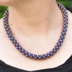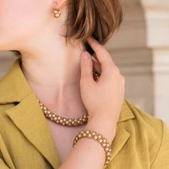 Cette collection de bijoux en perles de verre tissées à la main en France s’inspire des délicats travaux de passementerie en croisé de perles qui ornaient généreusement les vêtements des puissants à cette époque.
