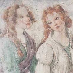 Cette étole est une représentation d’un détail de l’œuvre de Alessandro Filipepi dit Botticelli (Florence, vers 1445 – Florence, 1510) Vénus et les Trois Grâces offrant des présents à une jeune fille , fresque provenant de la villa Lemmi, une propriété proche de Florence ayant appartenu à la famille Tornabuoni, alliée aux Médicis. Aussi, a-t-on supposé que Botticelli avait pu recevoir la commande de ce décor à l’occasion des noces d’un membre de cette influente dynastie florentine et que la jeune femme pouvait être Nanna di Niccolò Tornabuoni. Vénus, escortée des trois Grâces, dépose un présent dans le linge que lui tend la jeune fiancée.