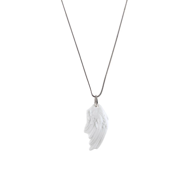 Ce pendentif en faïence sur chaîne en argent a été créé par la designer Marie-Christine Dorner et est inspirée des sculptures d’ailes conservées au Louvre