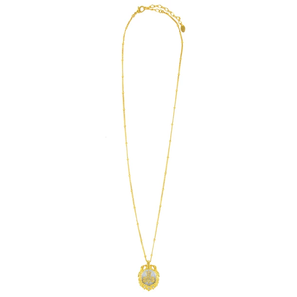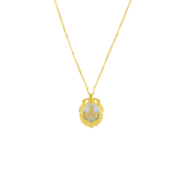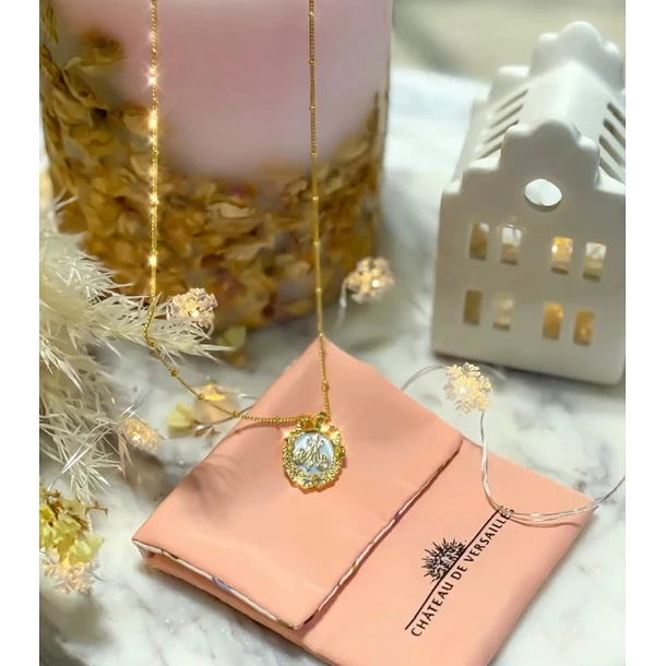 La maison les Néréides Paris a réalisé pour la RmnGP un pendentif Marie-Antoinette, en reprenant ces caractéristiques stylistiques : le monogramme de la Reine, aux entrelacs de feuille d’acanthe, repose sur un fond bleu dragée, teinte que Marie-Antoinette choisit en 1787 pour redécorer son boudoir du Petit Trianon. Il est surmonté d’un nœud de ruban stylisé, et s’appuie sur une guirlande de fleurs champêtres finement ciselées.