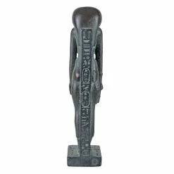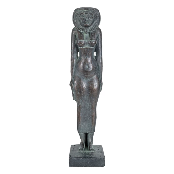 Debout, la déesse Bastet porte une tête de lion aux yeux incrustés. Chez les Égyptiens anciens, l’observation du cycle annuel du Nil (la crue alternant avec la sécheresse), créa le mythe de la déesse. Ainsi, l’œil du soleil, fille de Ré, s’était mis en colère et, transformé en lionne, s’était enfui en Nubie.