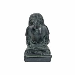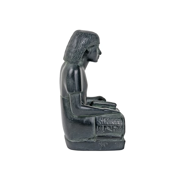 Lorsqu’il travaille, le scribe est assis en tailleur, tenant d’une main le calame et de l’autre une palette trouée de deux godets d’encre rouge et noire ; un rouleau de papyrus est déroulé sur ses genoux.