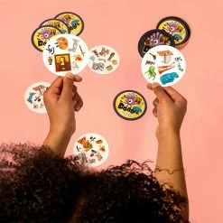 En jouant au Dobble, les joueurs se font concurrence pour trouver le symbole de correspondance entre deux cartes. Chaque carte est unique et n’a qu’un seul symbole en commun avec toutes les autres cartes dans le jeu. La correspondance peut être difficile à repérer car la taille et le positionnement des symboles peuvent varier sur chaque carte. Une fois qu’un joueur trouve le match, il le crie avant les autres joueurs et il peut alors prendre la carte ou la placer à un autre endroit en fonction des cinq mini-jeux auxquels ils jouent.