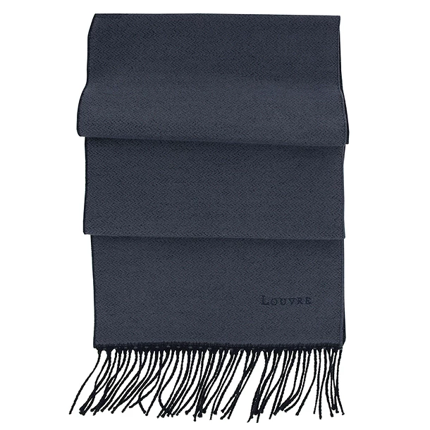 Écharpe en laine bleu marine, douce et très chaude, brodée avec la mention « Louvre ».