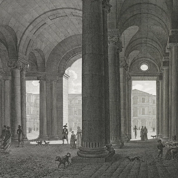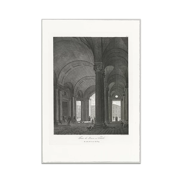 Cette estampe gravée par Louis-Pierre Baltard Morse représente l’entrée du Louvre, ou vestibule du côté de la rue du Coq.
