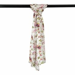 Cette étole, « Grand Broché » de la Reine, s’inspire d’un lampas broché à fond blanc, à grand décor de fleurs, rubans et plumes de paons ; il ornait la chambre de Marie-Antoinette à Versailles.