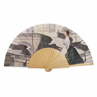 Le motif de cet éventail s’inspire d’un portrait de l’Impératrice Eugénie en 1855 par le peintre allemand Franz Xaver Winterhalter (1805-1873); et en arrière-plan une vue du château de Fontainebleau et plus particulièrement l’escalier en Fer-à-cheval, aux formes atypiques, construit à la demande de Louis XIII entre 1632 et 1634 et attribué à l’architecte Jean Androuet du Cerceau, il permet de mettre en scène l’accès à la galerie François Ier et aux Grands Appartements du château.