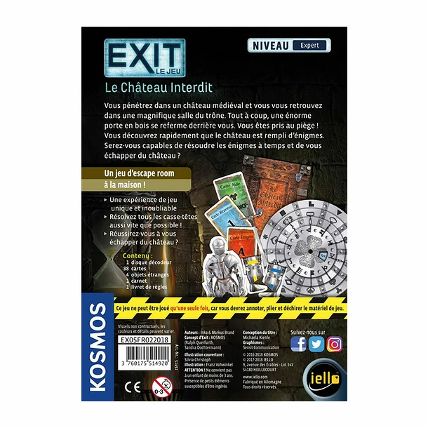 EXIT est un jeu qui reprend les sensations des « escape games ». Muni d’indices, de matériel et d’un décodeur, vous aurez pour mission de sortir du jeu le plus rapidement possible.
