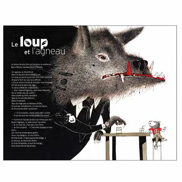 Des dents acérées et sanguinolentes d’un loup attablé avec un mouton peace and love (yo man !), au coche sous haute tension emporté par une mouche binoclarde, du lièvre désinvolte coiffé au poteau par une tortue sponsorisée par le Vieux Campeur, en passant par un maître corbeau aux allures d’un Pavarotti dépouillé par un renard flatteur, sans oublier le bœuf blasé par une grenouille toute boursouflée de son désir de grandeur…