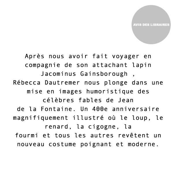 Illustratrice talentueuse au style unique, connue pour ses nombreux succès, Rébecca Dautremer revisite avec hardiesse et un humour débridé les plus fameuses fables de La Fontaine. Elle apporte également, grâce à des graffitis, gracieusement fléchés aux mots compliqués, une approche résolument rock’n’roll aux textes !