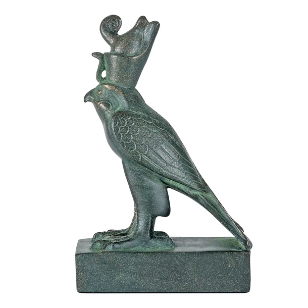 Horus est aussi figuré sous les traits d’un homme à tête de faucon. En tant que faucon, il est le grand dieu du ciel, ses yeux sont le soleil et la lune. Il est également dieu solaire sous le nom de Ré-Horakhty. Très ancien dieu d’Hierakonpolis, honoré depuis la Préhistoire, il est un dieu royal, protecteur du roi ; Pharaon est son représentant sur le trône d’Egypte (un des cinq noms qui composent la titulature royale est précisément le Nom d’Horus).