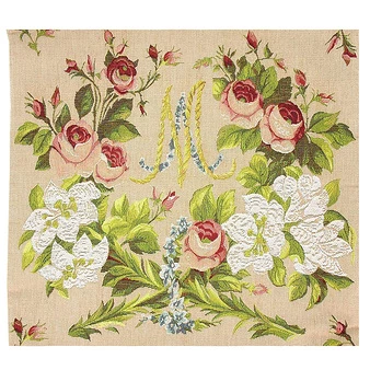 Ces roses et lys noués d’une guirlande de bleuets sont directement inspirés du projet de la courtepointe. Lorsqu’en 1786, Marie-Antoinette souhaite renouveler le meuble d’été, c’est-à-dire le décor textile de sa grande chambre, le Garde-Meuble fait appel au brodeur lyonnais Jean-François Bony pour réaliser les broderies du lit et des sièges qui doivent s’harmoniser avec la nouvelle tenture murale.