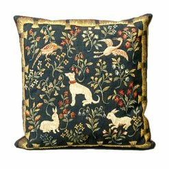 Cette housse de coussin composée de multiples petites fleurs et animaux typiques du Moyen Âge est une inspiration médiévale extraite de la série de tapisseries « La Dame à la Licorne », célèbre tenture du Moyen Âge exposée au musée de Cluny. Osez l’histoire dans votre salon !