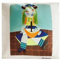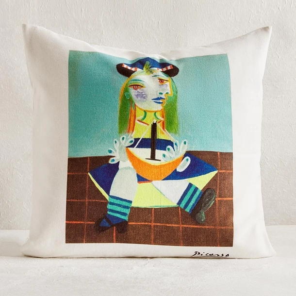 Housse de coussin en coton à fermeture Éclair, avec reproduction imprimée de l’œuvre « Maya au bateau » de Pablo Picasso (1881-1973).