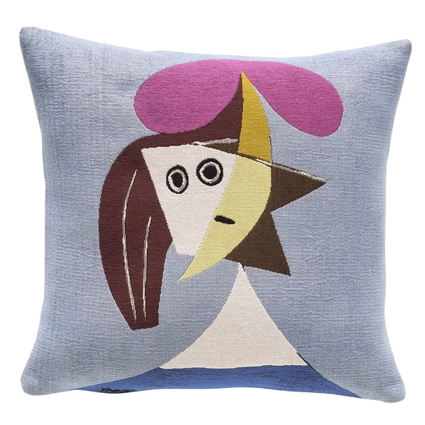 Cette housse de coussin fabriquée dans les ateliers de tissage Jules Pansu, reproduit le tableau Femme au Chapeau peint en 1935 par Pablo Picasso.