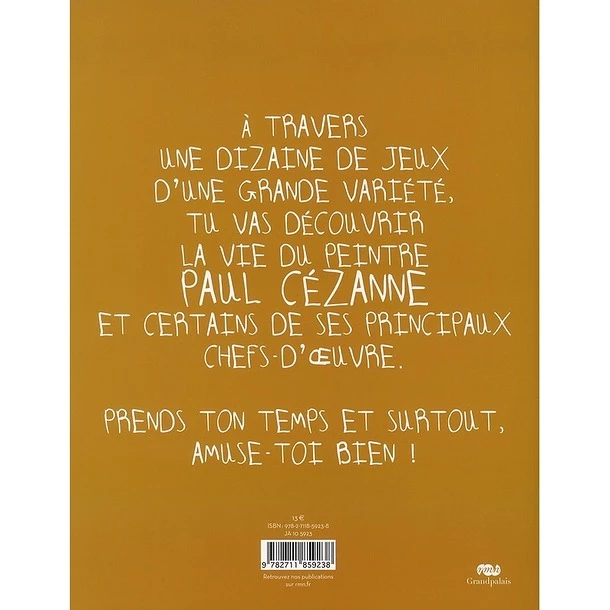 Cet ouvrage initie l’enfant à la peinture de Cézanne par le biais du jeu. Le texte est illustré par une quinzaine d’œuvres les plus représentatives de l’évolution de son art. En adéquation avec le tableau, les jeux incitent l’enfant à s’attarder sur chaque représentation : Compotier pommes…. Dessiner une nature morte, La Montagne Sainte Victoire… Identifier les couleurs, Les joueurs de cartes…jouer avec la symétrie.