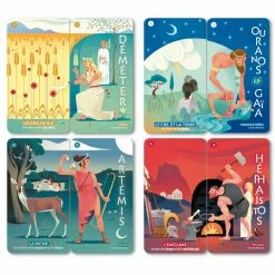 Les cartes illustrées, conçues sous forme de diptyques, permettent d’associer un personnage (dieu) à sa clé d’identification (attribut principal). Au fil des parties, les joueurs apprennent à reconnaître et à identifier les principaux dieux et déesses du monde grec grâce à leurs codes de représentation.