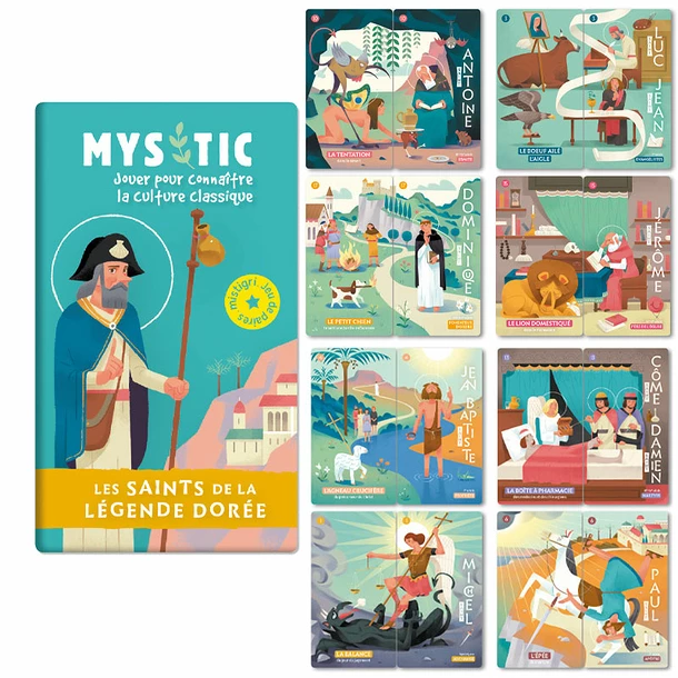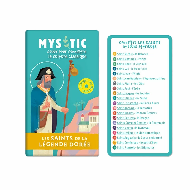 Le nouveau MYS’TIC est conçu pour donner les clés de lecture d’une grande partie de notre patrimoine religieux (églises et cathédrales, imagerie populaire, nom de rues…). La facilité de prise en main de ce jeu de paire, et le plaisir de manipuler les belles cartes illustrées permettent à toutes les générations de découvrir et apprendre à reconnaître une sélection de figures populaires de la culture chrétienne.