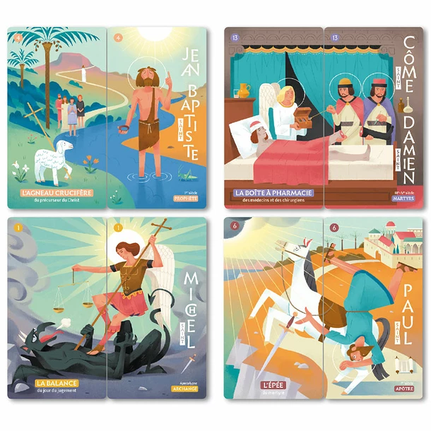 Les cartes illustrées, conçues sous forme de diptyques, permettent d’associer un personnage (saint) à sa clé d’identification (attribut principal). Au fil des parties, les joueurs apprennent à reconnaître et à identifier une sélection de saints incontournables de la tradition chrétienne grâce à leurs codes de représentation.