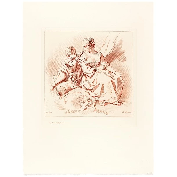 Ces compositions plaisantes, fraîches et spontanées furent gravées par Péquégnot d’après l’oeuvre de Boucher. L’artiste souhaitant suggérer un dessin, utilisa la technique du vernis mou lui permettant de reproduire sur le cuivre les effets graphiques du crayon sur le papier. Ces estampes sont habituellement imprimées avec une encre rouge-brun-sépia cherchant à se rapprocher de la chaleur visuelle du dessin à la sanguine.