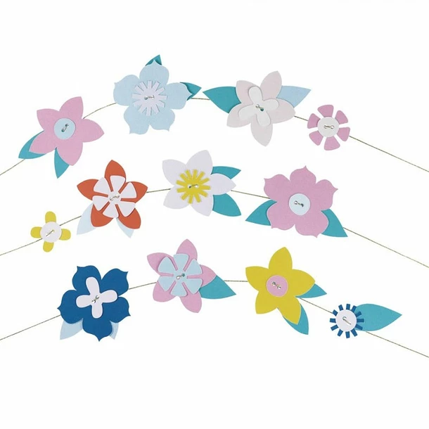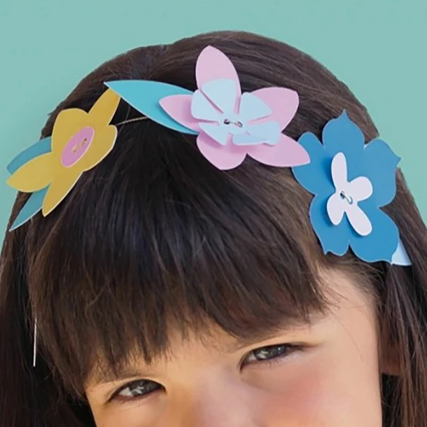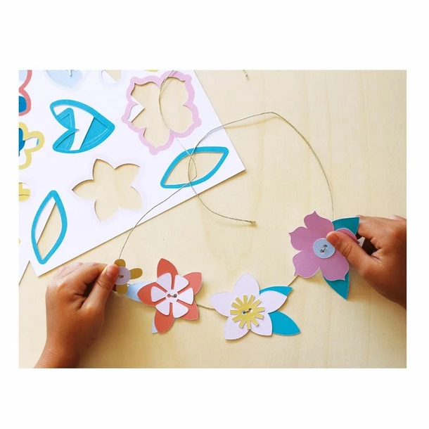 Les fleurs et feuilles en papier sont à assembler, selon son inspiration, le long d’un fil doré. Ce diy simple et amusant permet de créer 6 couronnes de fleurs à mettre dans les cheveux; le tout sans colle ni ciseaux.