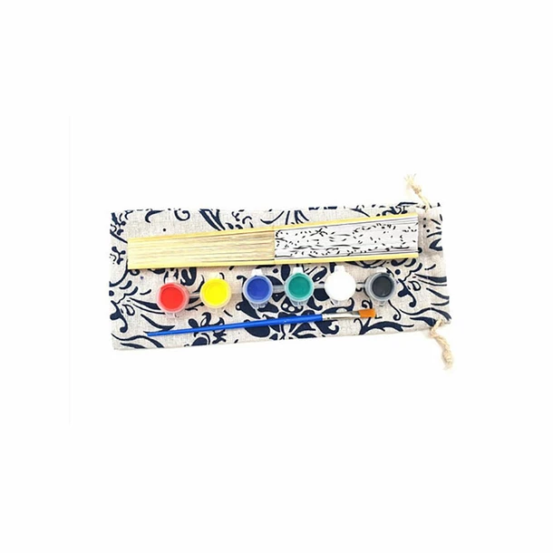 Ce kit est composé d’un éventail en bois et papier à colorier, d’un pinceau, d’une palette de 6 pots de 3ml de peinture et d’une pochette en tissus pour le ranger. Idéal pour faire un cadeau.