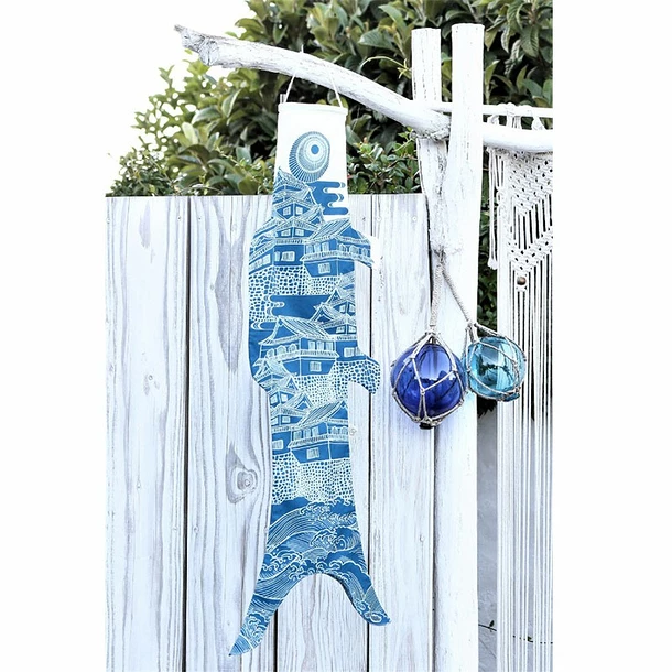 Nous devons ce koinobori Ôshiro Bleu à Atsushi, un artiste japonais aux multiples talents naviguant avec aisance entre le Japon et l’Europe. Atshushi a également signé la collection Shochikubaï.