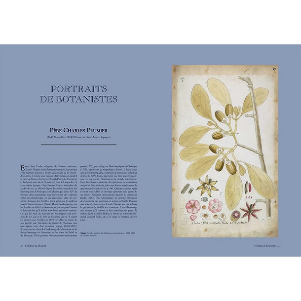 Il présente les portraits des grands botanistes qui l’ont constitué, Tournefort, les Jussieu, Humboldt et Bonpland, etc., ainsi qu’une sélection commentée de plus de quatre-vingt planches, parmi les plus belles de la collection. On pourra ainsi admirer le premier échantillon de Bougainvillier, rapporté du Brésil par Commerson, les couronnes de fleurs découvertes dans le sarcophage de Ramsès II, les différentes espèces de blé collectées par Adanson, ou les fleurs du désert de Théodore Monod.