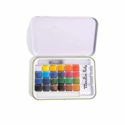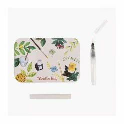 Boîte en métal avec 24 godets aquarelles aux couleurs intenses, un pinceau avec réservoir d’eau et une éponge. La boîte servira également de palette pour créer des mélanges de couleurs. Le kit idéal pour les artistes fans de nature !