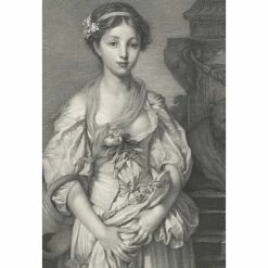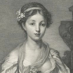 Cette estampe reproduit le célèbre tableau de Greuze datant de 1772 et conservé au Louvre. Le graveur garda la forme ovale de la toile en créant autour un cadre décoratif s’inspirant du cadre de bois doré.