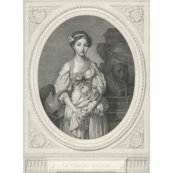 Cette estampe reproduit le célèbre tableau de Greuze datant de 1772 et conservé au Louvre. Le graveur garda la forme ovale de la toile en créant autour un cadre décoratif s’inspirant du cadre de bois doré.