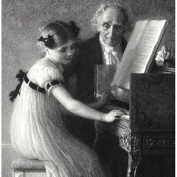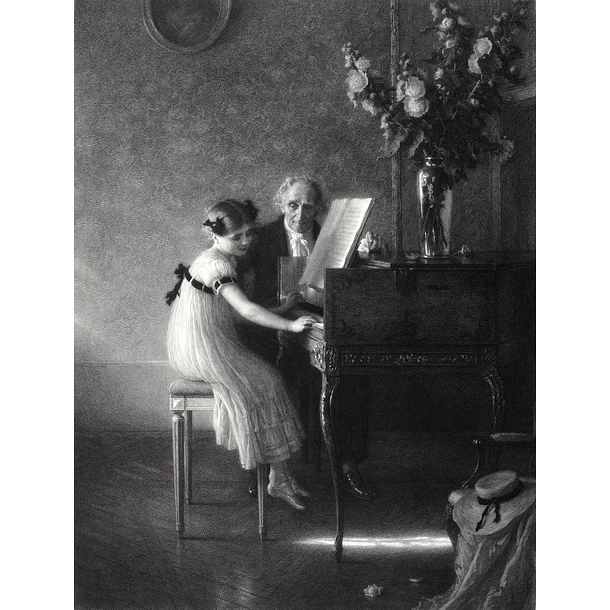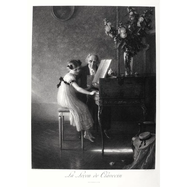 Une jeune fille est en train de jouer du clavecin, sous la conduite d’un vieux professeur. La scène se déroule dans un intérieur cossu aux murs tapissés. Au premier plan à droite, est posé le chapeau de la jeune fille. Un vase rempli de fleurs a été disposé sur le clavecin.