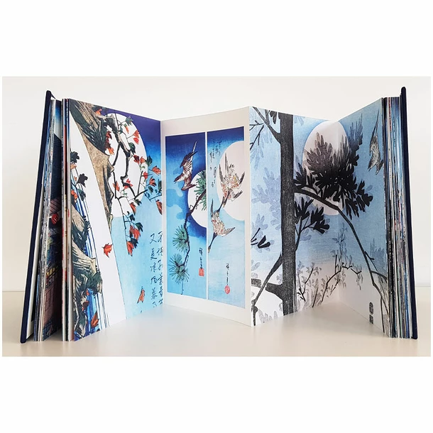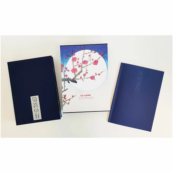 Les estampes réunies dans cet album témoignent de l’importance que la lune occupe dans l’imaginaire des artistes. Certaines illustrent clairement la fête de Tsukimi, montrant des réunions sur une terrasse ou sur le bord d’une rivière. D’autres rappellent son lien étroit avec la poésie, comme en attestent les feuillets entre les mains de quelques personnages, mais aussi avec les contes et les récits mythologiques – rappelés notamment par la présence de lapins. Ailleurs, la lune marque simplement le passage à la nuit, lorsque le soleil a disparu et que chacun se hâte de rentrer chez soi ; ou au contraire, quand la tombée du jour sonne le début d’une autre vie, celle des courtisanes et des plaisirs secrets. Enfin, présente parfois pour sa seule qualité esthétique, la lune éclaire un paysage, empreint dès lors de mystère, ou participe d’une composition savante et délicate, mêlant fleurs et oiseaux.