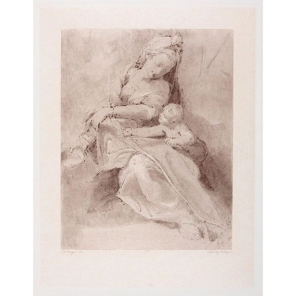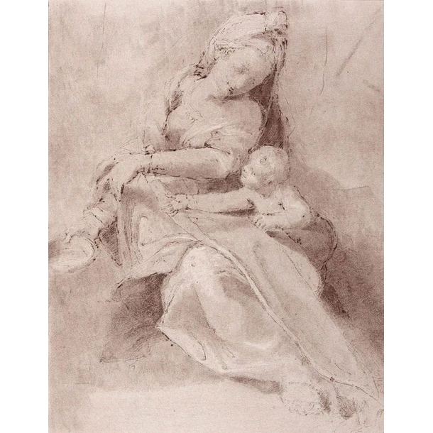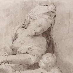 Cette estampe représentant un dessin de Corrège, qui est une esquisse préparatoire conservée au département des arts graphiques du Louvre. Le tableau de la Vierge à l’Écuelle (1529-1530) est aujourd’hui conservé à la Galerie Nationale de Parme en Italie.