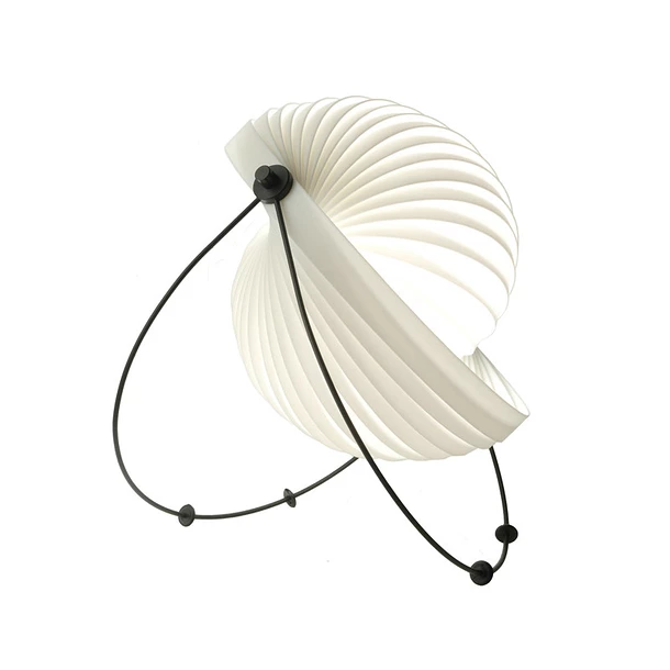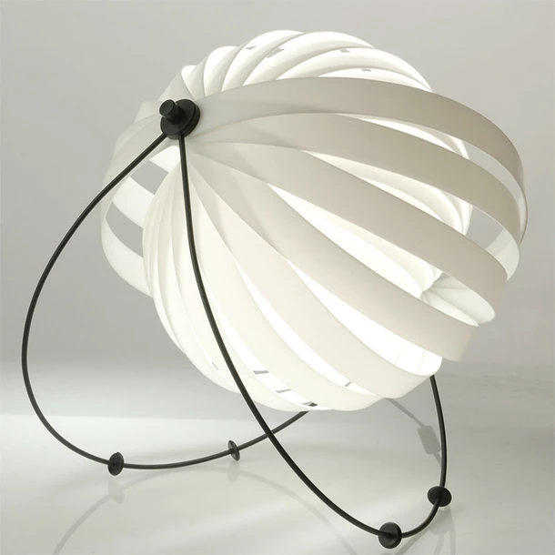 Une lampe intrigante et fascinante. Fabriquée à partir d’une unique bande de plastique enroulée sur elle même, la structure peut être manipulée afin d’en changer la forme et l’orientation de l’éclairage. Les pieds en métal sont équipés de petites pastilles permettant de maintenir la lampe dans différentes positions, et peuvent également être enlevés afin d’obtenir une suspension. La lampe est livrée dans un emballage plat sérigraphié, rappelant une « boîte à pizza ».