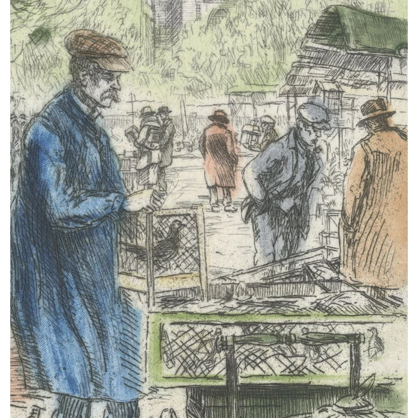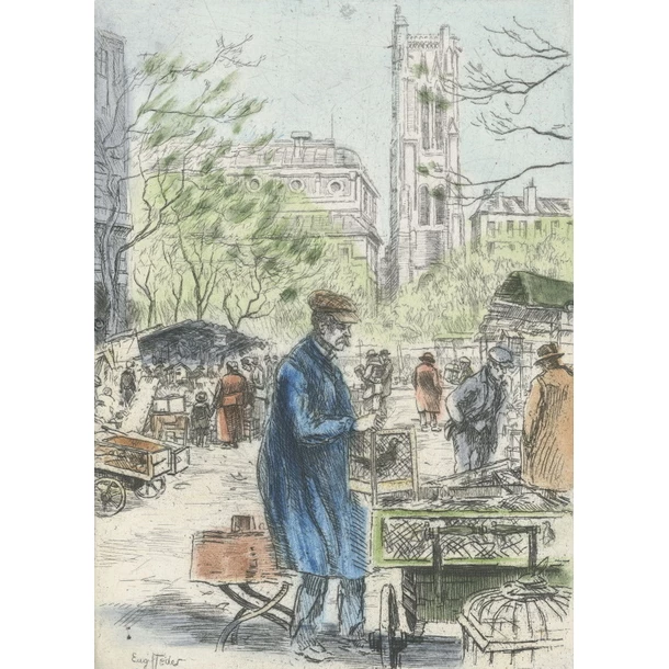 Graveur reconnu, Eugène Véder puisa son inspiration dans les rues de Paris et ses quartiers populaires. En 1923, le conservateur du musée Carnavalet, Jean Robiquet, écrivait à son endroit : « Ne lui demandez pas d’où il vient, ni où il a apprit à regarder, à crayonner et à sentir. Son œuvre l’indique assez clairement, les petits marchés en plein air, les étals de la rue St-Jacques, les pentes de l’herbe rare des fortifs, les coins perdus du vieux Montmartre, tels furent ses premiers champs d’observation, ses premiers ateliers de peintre. Préservé de toute influence d’école, il n’a eu d’autre maître que Paris, d’autre enseignement que le spectacle quotidien de nos rues et de nos faubourgs, d’autres modèles que les passants. Et voilà sans doute le secret d’un talent si original, d’une œuvre où le moindre détail prend un accent de vérité. »